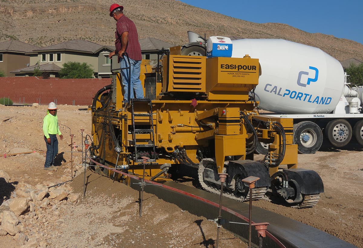 The Easi-Pour Compact 880 is a versatile slipform paver for curb and gutterand flatwork. Key specs include a max barrier height of 42 inches, a max flatwork paving width of 8 feet, and a minimum tight radius pour of 24 inches. It features a 1.75 cu. yd. hopper, a sliding trimmer for simultaneous trimming and pouring, and options for tracks or rubber tires.